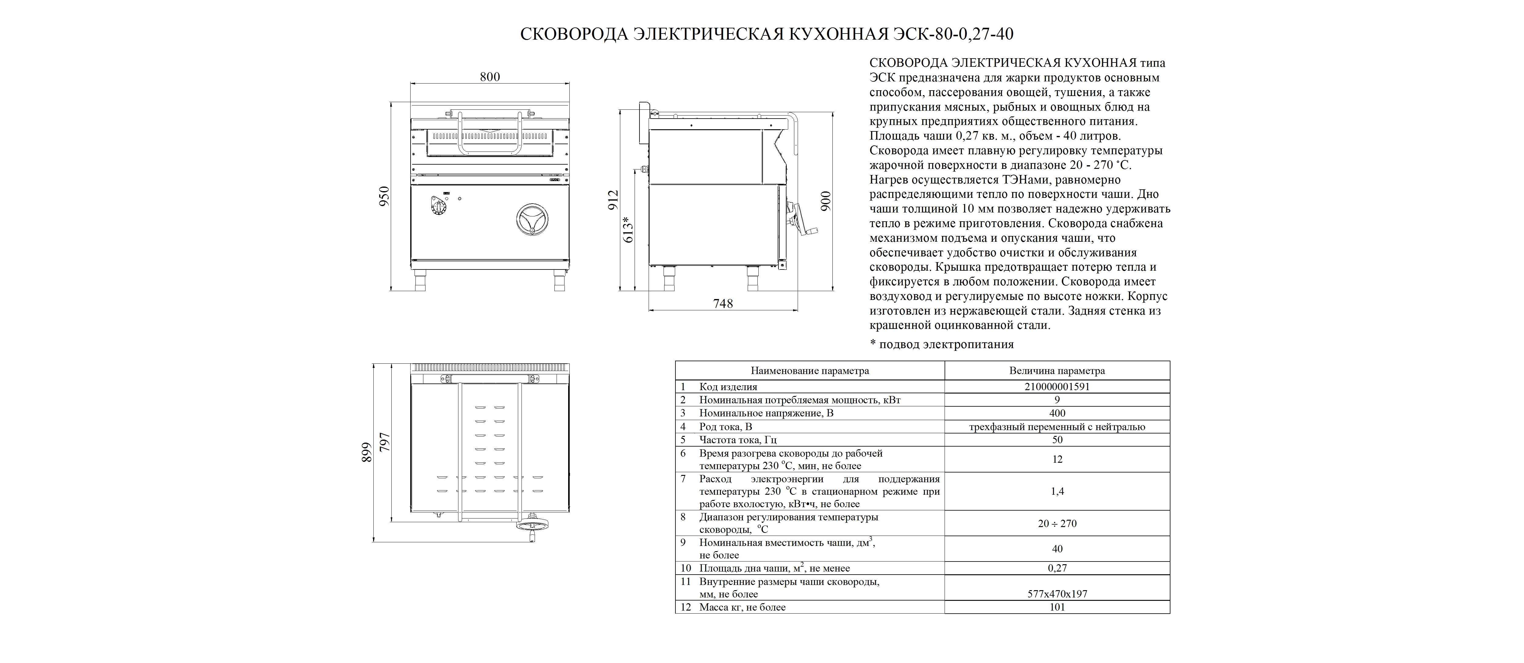 Сковорода имеет плавную регулировку температуры жарочной поверхности в диапазоне 20-270 С. Нагрев осуществляется ТЭНами, равномерно распределяющими тепло по поверхности чаши. Дно чаши толщиной 10 мм. Позволяет надежно удерживать тепло в режиме приготовления. Сковорода снабжена механизмом подъема и опускания чаши, что обеспечивает удобство опорожнения и обслуживания сковороды. Крышка предотвращает потерю тепла и фиксируется в любом положении. Сковорода имеет регулируемые по высоте ножки.