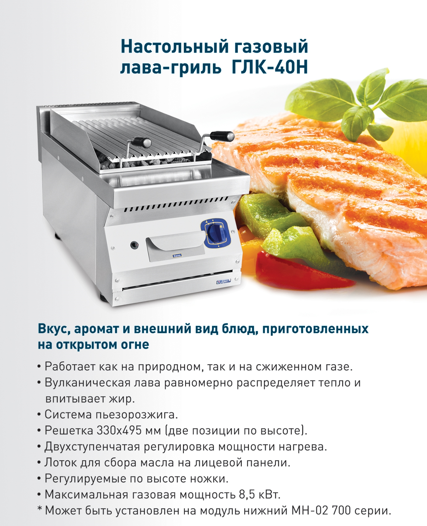 Лава гриль ГЛК-40Н настольный предназначен для приготовления мясных, рыбных и др. блюд по вкусу, аромату и внешнему виду словно приготовленных на открытом огне. Аппарат может использоваться как самостоятельно, так и в составе технологических линий.
