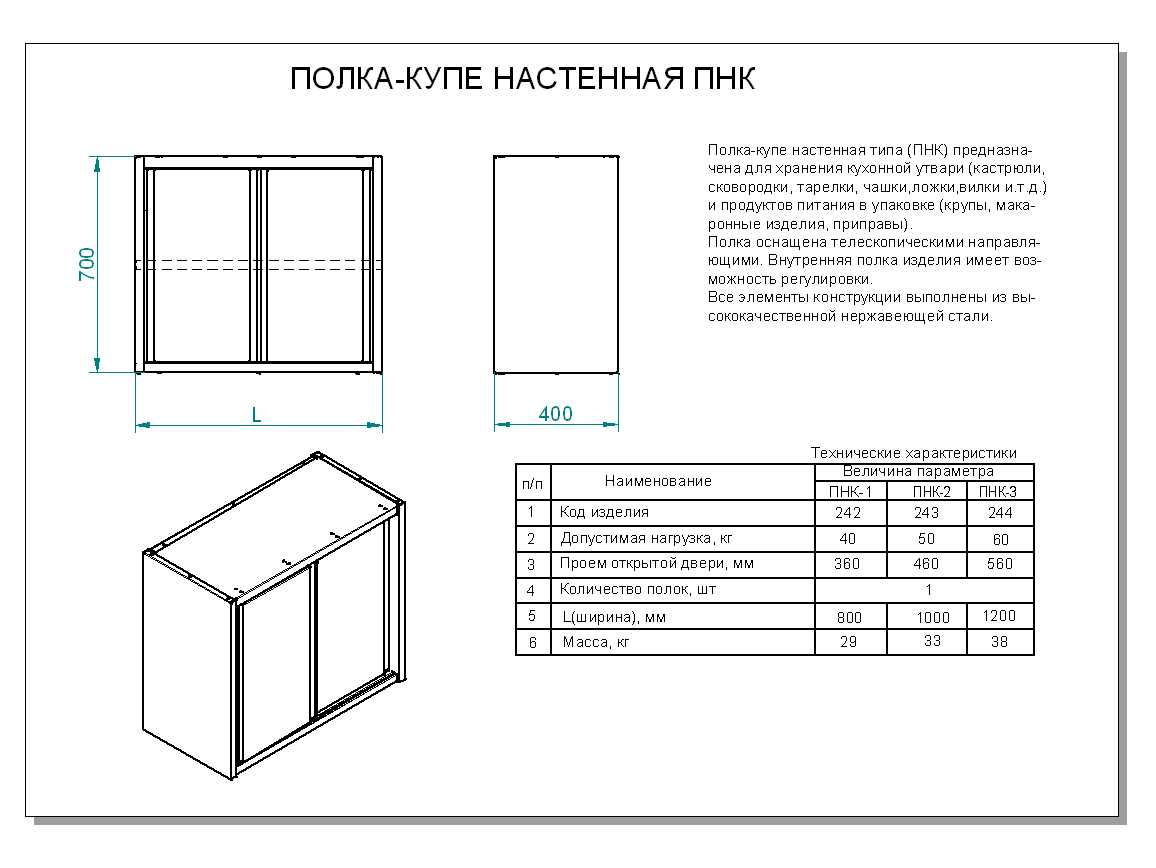 Кухонная полка ABAT ПНК-2 предназначена для хранения кухонной утвари и продуктов питания в упаковке на предприятиях общественного питания и торговли. Оснащена телескопическими направляющими. Имеет 2 раздвижные дверцы-купе. Изготовлена из нержавеющей стали.